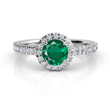 Anillo de Compromiso Esmeralda Natural Redonda 6mm y Montura Halo de Diamantes Diseño Exclusivo Ancho de 1.7MM Pavé con 0.20 quilates Diamantes en Oro Blanco de 14K. El precio ya incluye la Esmeralda, el certificado de gemólogo y la caja para entrega. También disponible en oro rosa, amarillo.