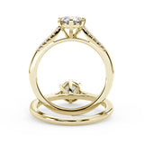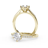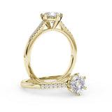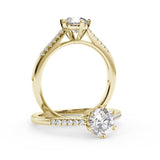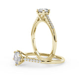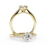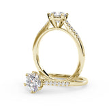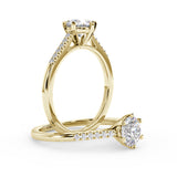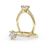 Anillo de Compromiso Estilo Solitario con Diseño Clasico de Seis Puntas y Pave de Diamantes ancho de 2.0mm esta hecho en Oro Amarillo de 18 Kilates e Incluye Diamantes en la Montura. Puedes seleccionar el Diamante de tu preferencia para esta Montura o nos puedes contactar para que te ayudemos a elegir el Diamante ideal contigo. Precio es por la Montura Unicamente.