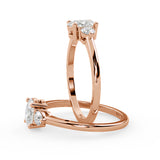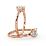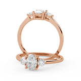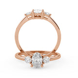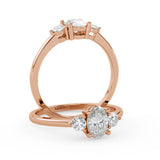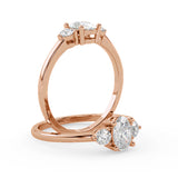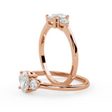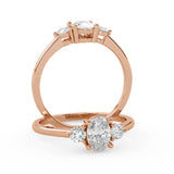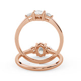 Montura Estilo Tres Piedras Oval 6.5 x 4.5 mm Diseño Exclusivo de 4 Puntas Ancho de 1.9mm en Oro Rosa de 14K. Crea un anillo único eligiendo tu gema central favorita en el siguiente paso. Contacta a tu asesor vía whatsapp para más fotos y videos o bien para la elección del diamante ideal. El precio únicamente es por la montura.