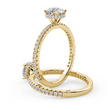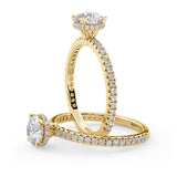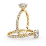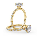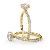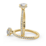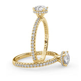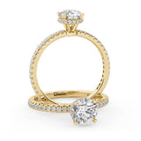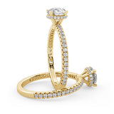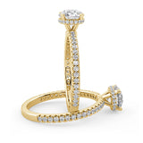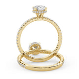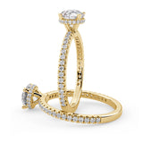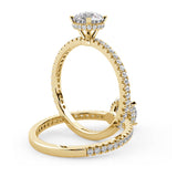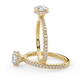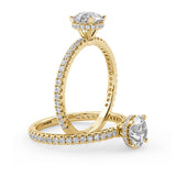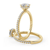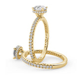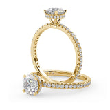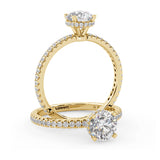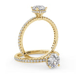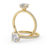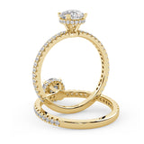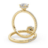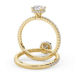 Anillo de Compromiso Olivia Estilo Solitario de 4 Puntas con Hidden Halo y Pave de Diamantes ancho de 1.8mm esta hecho en Oro Amarillo de 14 Kilates e Incluye Diamantes en la Montura. Puedes seleccionar el Diamante de tu preferencia para esta Montura o nos puedes contactar para que te ayudemos a elegir el Diamante ideal contigo. Precio es por la Montura Unicamente.