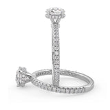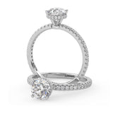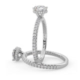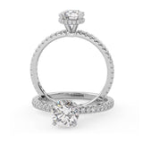Anillo de Compromiso Olivia Estilo Solitario de 4 Puntas con Hidden Halo y Pave de Diamantes ancho de 1.8mm esta hecho en Oro Blanco de 18 Kilates e Incluye Diamantes en la Montura. Puedes seleccionar el Diamante de tu preferencia para esta Montura o nos puedes contactar para que te ayudemos a elegir el Diamante ideal contigo. Precio es por la Montura Unicamente.