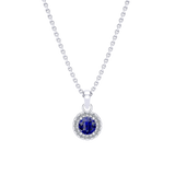 Pendiente Redondo de Zafiro Natural de 4.5mm con Halo de Diamantes en el pendiente. Los pendientes están hechos en Oro Blanco de 14 Kilates. Precio ya incluye el pendiente y el Zafiro y los Diamantes como se muestra en la imagen.