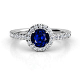 Anillo de Compromiso "Sapphire Nova" con Zafiro Azul Natural Redondo de 6mm y Montura Estilo Halo de Diamantes Diseño Exclusivo Ancho de 1.7mm con 0.20 quilates Diamantes en Oro de 14K. El precio ya incluye el Zafiro Natural, la montura y la caja para entrega. Disponible en oro rosa, blanco, amarillo y platino.