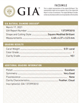 Este Diamante de 0.51 Quilates corte Princesa es de Color I, Claridad VS1, Corte Excelente, Pulido Excelente, Buena Simetría y viene con Certificado GIA (Gemological Institute of America)